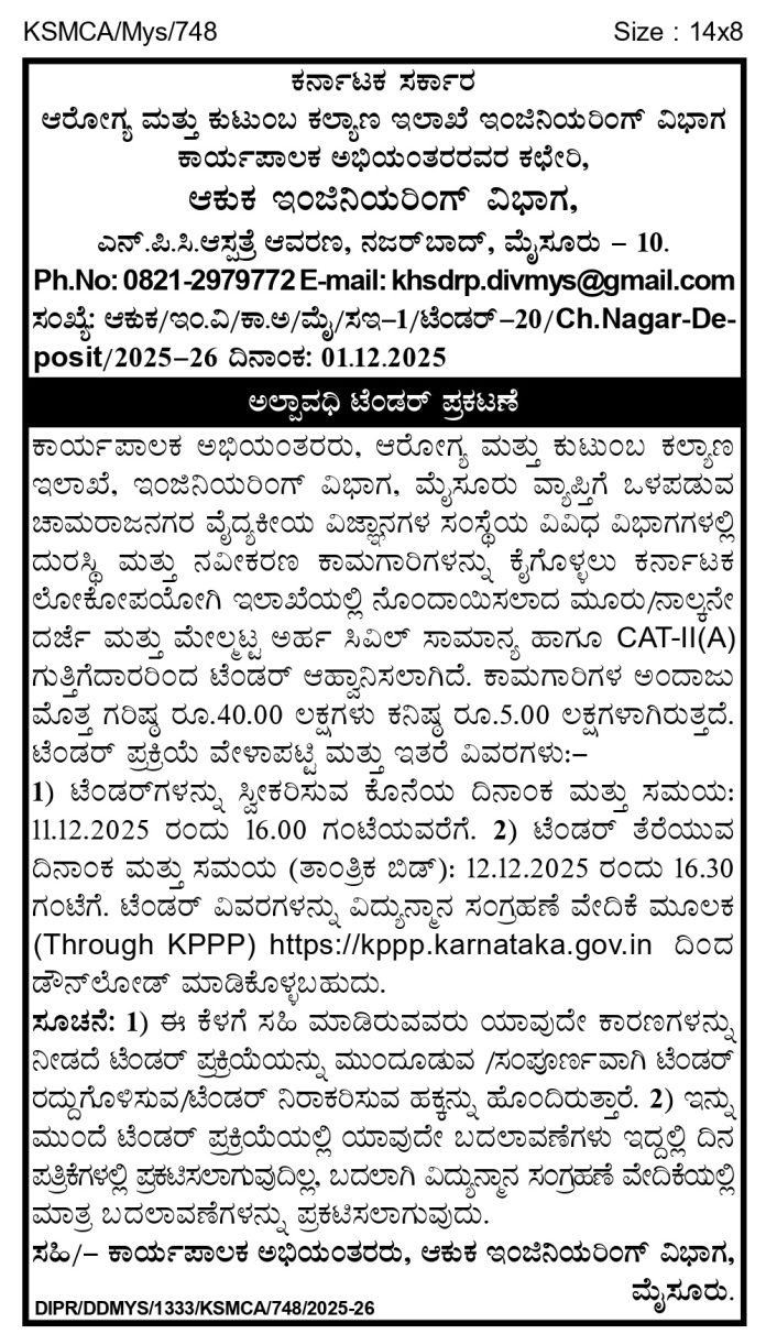 Tenders ಆರೋಗ್ಯ ಮತ್ತು ಕುಟುಂಬ ಕಲ್ಯಾಣ ಇಲಾಖೆ ಇಂಜಿನಿಯರಿಂಗ್ ವಿಭಾಗ, ಮೈಸೂರು By prashanth - 08/12/2025 FacebookTwitterPinterestWhatsApp