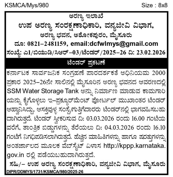 Tenders ಉಪ ಅರಣ್ಯ ಸಂರಕ್ಷಣಾಧಿಕಾರಿ, ವನ್ಯಜೀವಿ ವಿಭಾಗ, ಮೈಸೂರು By prashanth - 27/02/2026 FacebookTwitterPinterestWhatsApp