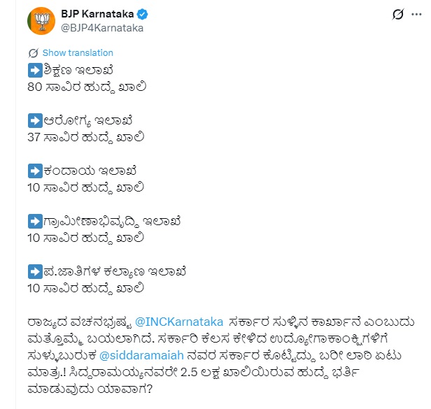 ರಾಜ್ಯದಲ್ಲಿ ಖಾಲಿ ಇರುವ 2.5 ಲಕ್ಷ ಹುದ್ದೆಗಳ ಭರ್ತಿ ಯಾವಾಗ? ಸರ್ಕಾರಕ್ಕೆ ಕುಟುಕಿದ ಬಿಜೆಪಿ