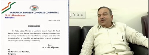 ಬೆಂಗಳೂರು,ಏಪ್ರಿಲ್,15,2026 (www.justkannada.in): ದಾವಣಗೆರೆ ದಕ್ಷಿಣ ಉಪಚುನಾವಣೆಯಲ್ಲಿ ಪಕ್ಷ ವಿರೋಧಿ ಚಟುವಟಿಕೆ ಆರೋಪ ಕೇಳಿ ಬಂದ ಹಿನ್ನೆಲೆಯಲ್ಲಿ ವಿಧಾನಪರಿಷತ್ ಸದಸ್ಯ ಅಬ್ದುಲ್ ಜಬ್ಬಾರ್ ಅವರನ್ನು ಕಾಂಗ್ರೆಸ್ ಪಕ್ಷದ ಪ್ರಾಥಮಿಕ ಸದಸ್ಯತ್ವದಿಂದಲೇ  ಅಮಾನತು ಮಾಡಿ ಕೆಪಿಸಿಸಿ ಅಧ್ಯಕ್ಷ ಹಾಗೂ ಡಿಸಿಎಂ ಡಿಕೆ ಶಿವಕುಮಾರ್ ಆದೇಶ ಹೊರಡಿಸಿದ್ದಾರೆ.