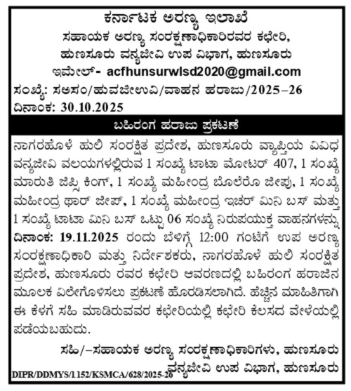 Tenders ಸಹಾಯಕ ಅರಣ್ಯ ಸಂರಕ್ಷಣಾಧಿಕಾರಿಯವರ ಕಚೇರಿ, ಹುಣಸೂರು By prashanth - 03/11/2025 FacebookTwitterPinterestWhatsApp