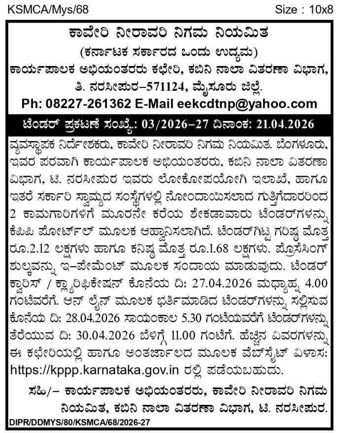 Tenders ಕಾವೇರಿ ನೀರಾವರಿ ನಿಗಮ ನಿಯಮಿತ, ಟಿ.ನರಸೀಪುರ By prashanth - 27/04/2026 FacebookTwitterPinterestWhatsApp