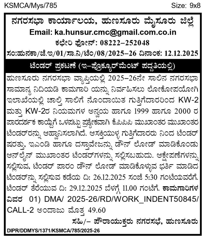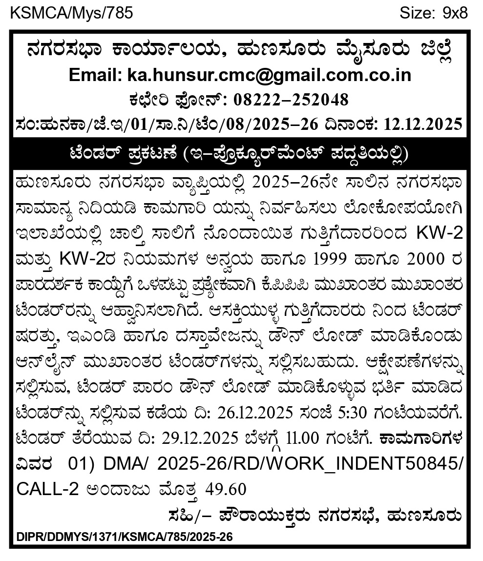 Tenders ನಗರಸಭಾ ಕಾರ್ಯಾಲಯ, ಹುಣಸೂರು ಮೈಸೂರು ಜಿಲ್ಲೆ By prashanth - 19/12/2025 FacebookTwitterPinterestWhatsApp