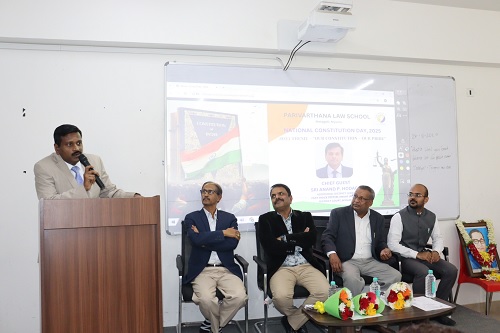 ಪರಿವಾರ್ತನಾ ಲಾ ಶಾಲೆಯಲ್ಲಿ ನಡೆದ ಭಾರತೀಯ ಸಂವಿಧಾನ ದಿನಾಚರಣೆಯ ಕಾರ್ಯಕ್ರಮದಲ್ಲಿ ಮುಖ್ಯ ಅತಿಥಿಗಳಾಗಿ ಪಾಲ್ಗೊಂಡು ಮಾತನಾಡಿದ FTSC (POCSO) ಹೆಚ್ಚುವರಿ ಜಿಲ್ಲಾ ನ್ಯಾಯಾಧೀಶರಾದ ಶ್ರೀ ಆನಂದ್ ಪಿ. ಹೊಗಾಡೆ ಅವರು, ಭಾರತೀಯ ಸಂವಿಧಾನದ ಮಹತ್ವವನ್ನು ವಿವರವಾಗಿ ಪ್ರತಿಪಾದಿಸಿದರು. ಸಂವಿಧಾನದ ಪ್ರಮುಖ ವೈಶಿಷ್ಟ್ಯಗಳು, ನಾಗರಿಕ ಹಕ್ಕುಗಳ ರಕ್ಷಣೆ, ನ್ಯಾಯ-ಸಮಾನತೆಯ ಮೌಲ್ಯಗಳು ಮತ್ತು ಸಂವಿಧಾನದ ಚೇತನಾಶೀಲತೆ ಕುರಿತು ವಿಶ್ಲೇಷಣೆ ಮಂಡಿಸಿದರು. ಭಾರತೀಯ ಸಂವಿಧಾನಕ್ಕೆ ಸಂಬಂಧಿಸಿದ ಇತ್ತೀಚಿನ ಕಾನೂನುಗಳು ಹಾಗೂ ನ್ಯಾಯಾಲಯಗಳಿಂದ ನಿರ್ಣಯಿಸಲ್ಪಟ್ಟ ಹಲವು ಪ್ರಕರಣಗಳನ್ನು ಉಲ್ಲೇಖಿಸಿದರು.
