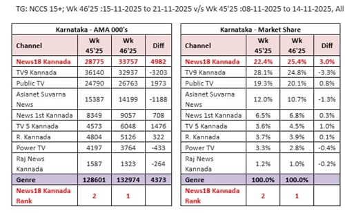 ಬೆಂಗಳೂರು, ನ.೨೭,೨೦೨೫: ಬಾರ್ಕ್ ಸಂಸ್ಥೆಯಿಂದ ಪ್ರತಿ ಗುರುವಾರ ಬಿಡುಗಡೆಯಾಗುವ ನ್ಯೂಸ್ ಚಾನೆಲ್ಗಳ ಟಿಆರ್ಪಿ ಪಟ್ಟಿಯಲ್ಲಿ ನ್ಯೂಸ್18 ಕನ್ನಡ ನಂ.1 ಕನ್ನಡ ಸುದ್ದಿವಾಹಿನಿಯಾಗಿ ಹೊರಹೊಮ್ಮಿದೆ. ಇದರೊಂದಿಗೆ ಹತ್ತಿರಹತ್ತಿರ ಎರಡು ದಶಕಗಳ ಟಿವಿ9 ಅಧಿಪತ್ಯ ಕೊನೆಗೊಂಡಿದೆ. ಈ ಜಾಗದಲ್ಲೀಗ ನ್ಯೂಸ್18 ಕನ್ನಡ ಹೊಸದಾಗಿ ತಲೆ ಎತ್ತಿರುವ ಮಾರ್ಕೆಟ್ ಲೀಡರ್.