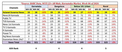ಬಾರ್ಕ್ ನೀಡಿರುವ ಈ ವಾರ (06ರಲ್ಲಿ) ಕನ್ನಡ ನ್ಯೂಸ್ ಚಾನೆಲ್‌ ಗಳ ಟಿಆರ್‌ಪಿ ಏರುಪೇರಾಗಿದೆ. BARC ವರದಿ ಪ್ರಕಾರ, ಕರ್ನಾಟಕದ ನ್ಯೂಸ್ ಚಾನೆಲ್‌ ಗಳ ಟಿಆರ್‌ ಪಿಯಲ್ಲಿ ಗಮನಾರ್ಹ ಬದಲಾವಣೆ ಕಂಡುಬಂದಿದೆ. ರಾಜ್ಯ ಮಟ್ಟದಲ್ಲಿ ಒಟ್ಟು ನ್ಯೂಸ್ ಟೋಟಲ್ 351ರಿಂದ 321ಕ್ಕೆ ಇಳಿಕೆಯಾಗಿದ್ದು, ಶೇಕಡಾ 9ರಷ್ಟು ಕುಸಿತ ಕಾಣುವ ಮೂಲಕ ದಾಖಲಾಗಿದೆ.