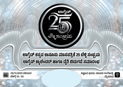 ಮೈಸೂರು,ನವೆಂಬರ್,27,2025 (www.justkannada.in): ನವೆಂಬರ್ 29 ರಂದು ಲಾಗೈಡ್ ಕನ್ನಡ ಕಾನೂನು ಮಾಸಪತ್ರಿಕೆ 25 ಬೆಳ್ಳಿ ಸಂಭ್ರಮ, ಲಾಗೈಡ್ ಕ್ಯಾಲೆಂಡರ್ ಮತ್ತು ಡೈರಿ ಬಿಡುಗಡೆ ಸಮಾರಂಭವನ್ನು ಆಯೋಜಿಸಲಾಗಿದೆ.