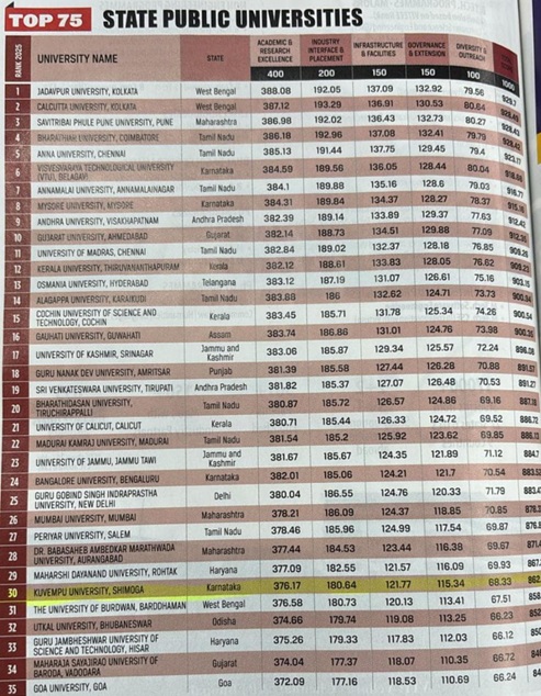 Mysuru: University of Mysore (UoM) has secured 8th rank among top 75 State Public Universities in the country in the Outlook ICARE Rankings – 2025. UoM Vice-Chancellor Prof. N.K. Lokanath, in a press release, has stated that this recognition was based on critical parameters including Academic & Research Excellence, Industry Interface & Placement, Infrastructure & Facilities, Governance & Extension and Diversity & Outreach.